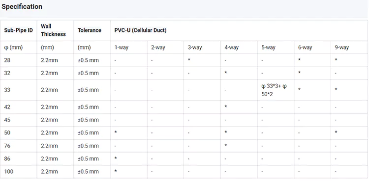 ทำจากวัสดุที่มีน้ำหนักเบาและติดตั้งข้อต่อระฆังและสปินสปอร์ตท่อจะช่วยให้การประกอบอย่างรวดเร็วและปลอดภัย รองรับการวางสายเคเบิลหลายสายพร้อมกันและทำให้ง่ายต่อการสำรองหลอดอะไหล่สำหรับการขยายตัวในอนาคตเพื่อเพิ่มประสิทธิภาพการติดตั้งอย่างมีนัยสำคัญ