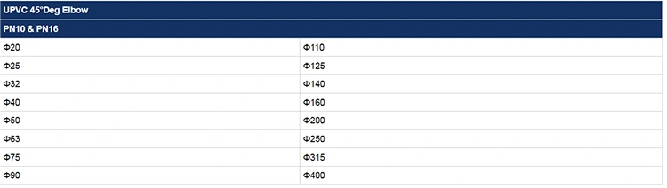สุดท้ายภายใต้สภาพการทำงานมาตรฐาน-รวมถึงอุณหภูมิปกติระดับความดันและการบำรุงรักษาตามปกติ-PVC 45 ° Elbow สามารถบรรลุอายุการใช้งานได้ถึง 50 ปีคุณลักษณะที่เน้นความทนทานและผลประโยชน์ทางเศรษฐกิจที่น่าทึ่งสำหรับการใช้งานระยะยาว
